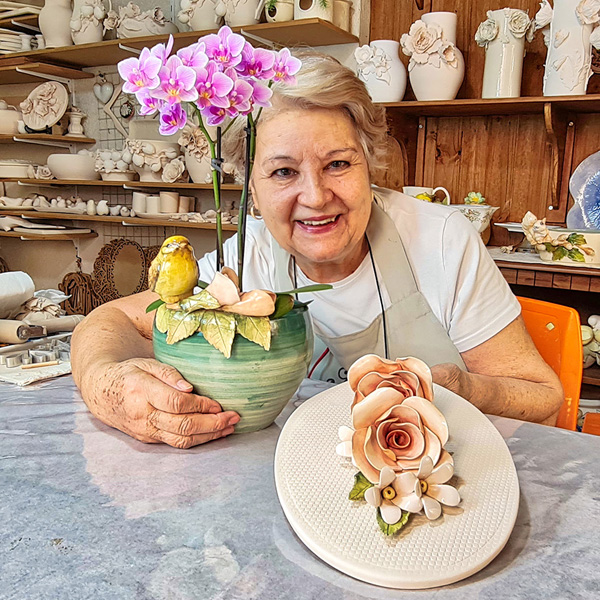 O grande diferencial deste curso é justamente isso: o estilo autêntico da artista, muito admirado e reconhecido na cerâmica artística brasileira e no exterior. Agora, você pode dominar essa estética refinada e cheia de personalidade, mesmo que nunca tenha segurado um pincel.